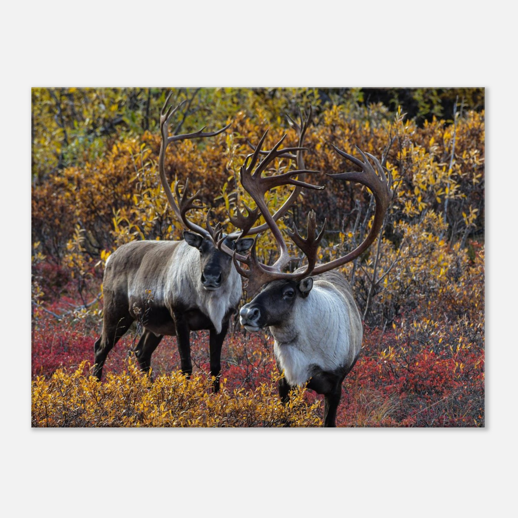Two Caribou Bulls roaming through the colorful fall scenery in Denali’s wilderness in Alaska